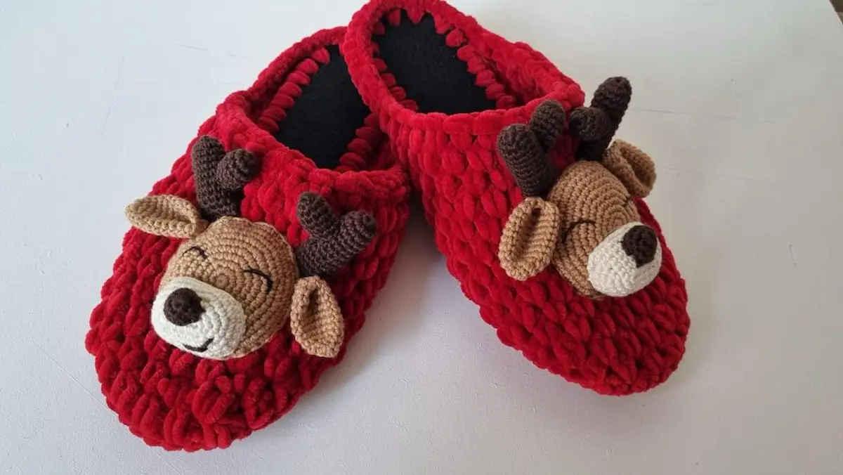 Merhabalar, kadife iplikten yeni yıl terliği tarifi ile karşınızdayım. Yeni yıl temalı terlikler genellikle renkli ve eğlenceli desenlere sahiptir. Ayrıca, sıcak tutan malzemelerden yapılmalı. Sıcacık kadife ip ile yapılmış terlikler evin konforunu ve rahatlığını hatırlatıyor. Yeni yıl terliğimizde geyik figürünü çalıştık. Sizler dilerseniz farklı karekter de figürler kullanarak terlikler örebilirsiniz.
